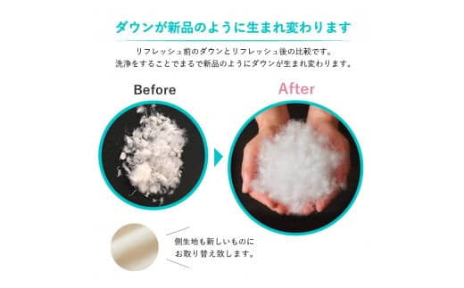 富士山の天然水で丁寧に汚れを洗浄し、最高ランクのマザーグースダウンを足し羽毛をすることでふんわりボリュームUP。