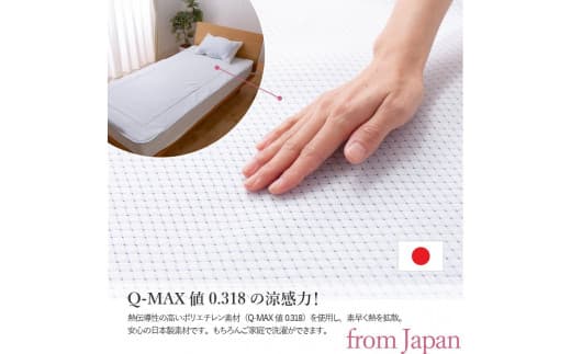 熱伝導性の高いポリエチレン素材(Q-MAX値0.318)を使用し、素早く熱を拡散。優れた日本製の冷感敷きパットです。表生地・裏生地共に、ハニカム構造素材を使用した立体二重構造のため、通気性・クッション性が抜群です。寝返りのたびにひんやり感がありますので、心地よくおやすみいただけます。ご使用時に扇風機や送風機などを併用していただきますと、さらに生地が放熱され、ひんやりを繰り返し感じていただけます。軽量で取り扱いが簡単です。ご家庭の洗濯機で丸洗いできます。