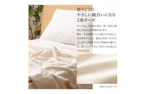 また、天然繊維である和ざらしガーゼのやさしい肌ざわりと風合いは、お洗濯をするたびに増していく ため、使うごとにやさしい風合いをお楽しみいただけます。