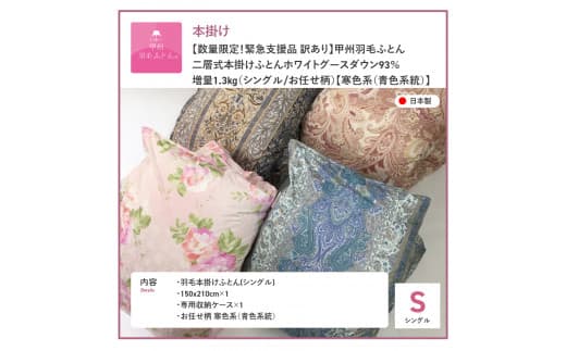 高品質 羽毛本掛け布団 「今だけ!ワケあり企画商品第二弾です。」 羽毛布団 【数量限定!緊急支援品 訳あり】甲州羽毛ふとん 二層式本掛け布団 ホワイトグースダウン93%増量1.3kg(シングル/お任せ柄)寒色 シングル 寝具