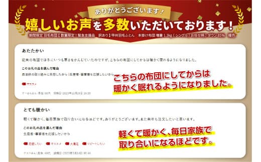良質なホワイトダックダウン85%をたっぷり増量1.3kg使用!【数量限定!緊急支援品 訳あり】【3月発送】甲州羽毛ふとん 本掛け布団 増量1.3kg (シングル/お任せ柄)ダウン85% 暖色