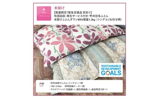 布団回収・再生サービス付き・高品質な羽毛ふとんです。 羽毛本掛け布団 羽毛布団 【数量限定!緊急支援品 訳あり】布団回収・再生サービス付き・甲州羽毛ふとん 本掛けふとんダウン85%増量1.3kg (シングル/お任せ柄) 掛け布団 シングル 寝具 本掛けふとん 羽毛布団 山梨 富士吉田