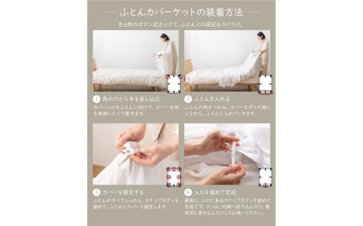 着脱がカンタンで中にふとんをいれずに使うとガーゼケットにもなるため、一年中お使いいただけるカバーです。ファスナーの無い特殊製法のため、ふとんが入れやすく、8箇所ボタン式ホックで取り付けも簡単です。