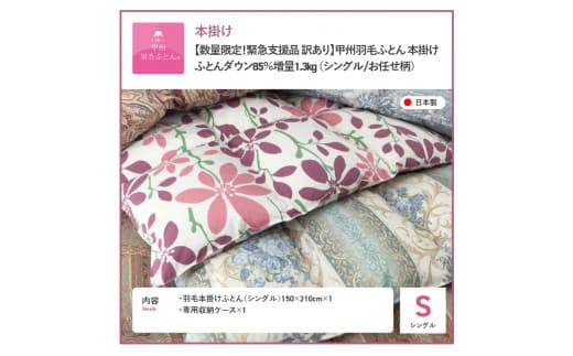 良質なホワイトダックダウン85%をたっぷり増量1.3kg使用!【数量限定!緊急支援品 訳あり】【2月発送】甲州羽毛ふとん 本掛けふとん増量1.3kg (シングル/お任せ柄)ダウン85% 寒色